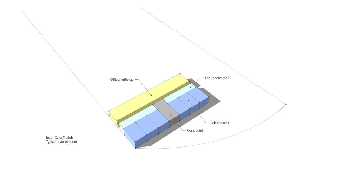 Indicative layout of one building floor, showing separation between office, labs and core/plant.