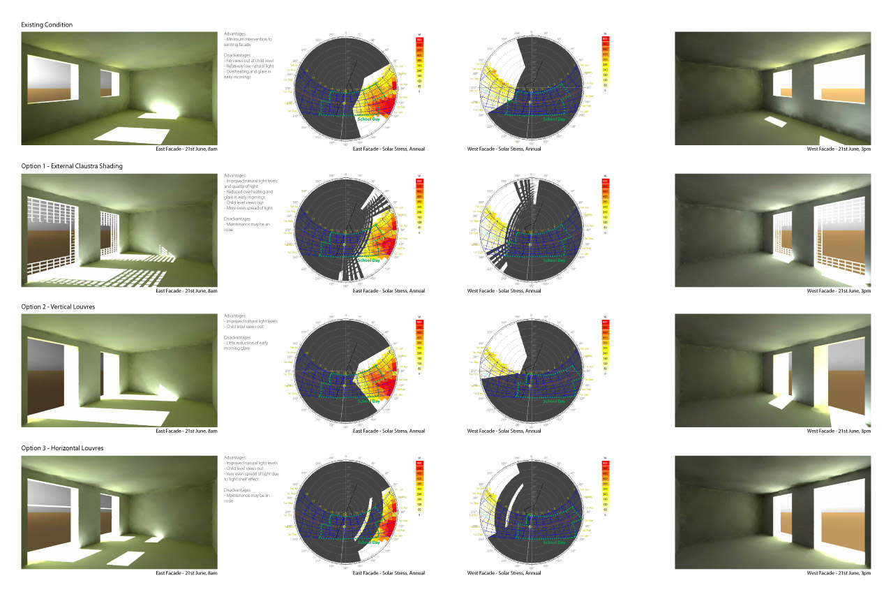 Daylight and solar radiation analysis for existing condition and three alternative design options.