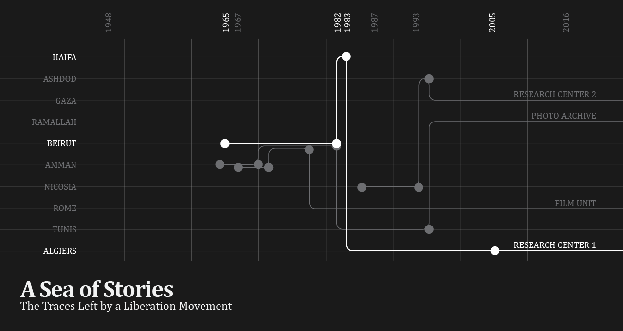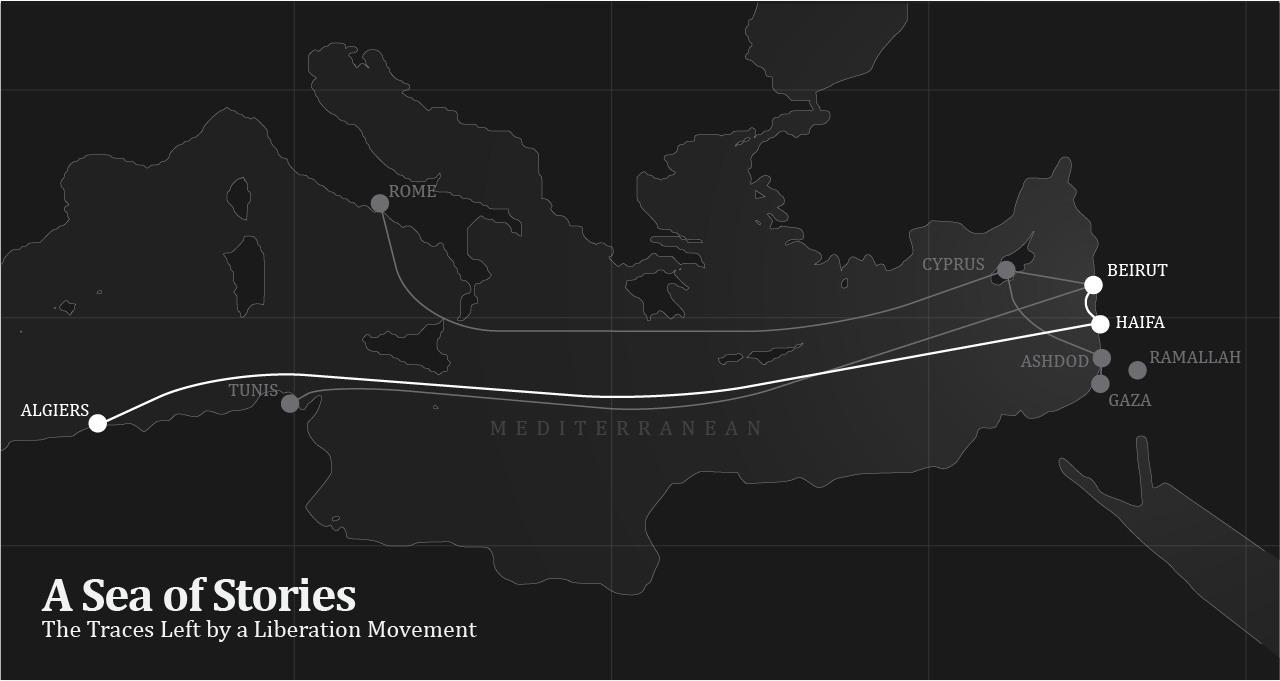 Sea of Stories: Voyages of the Palestinian Archive is an interactive exhibition charting the stories of three significant archives of the Palestinian revolutionary period — the Palestinian Cinema Institution, the PLO Research Centre and WAFA News Agency — as they are displaced and fragmented across the Mediterranean, from Beirut and Amman to Haifa, Cyprus, Gaza, Ramallah, Tunis and the Algerian desert.