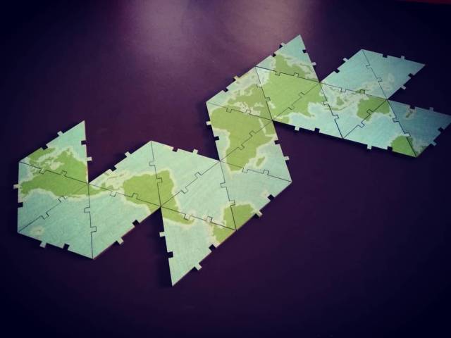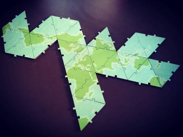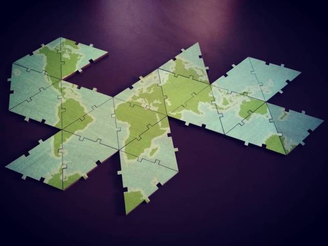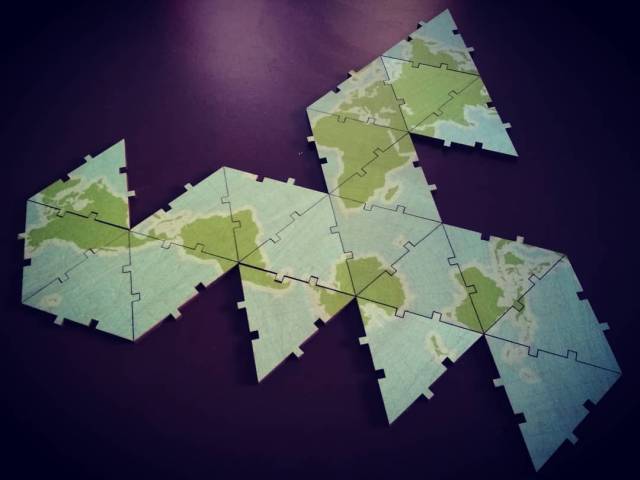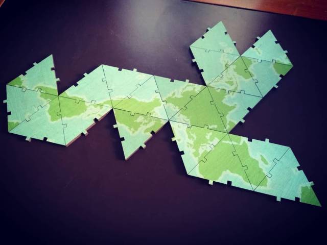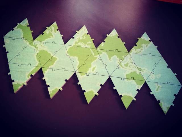 This project was just a bit of fun. I love maps, but like most people who care about the art of mapmaking, I’m also bored to death of the Mercator projection. Yet, at the same time, the world doesn’t fit neatly on a flat page anyway, so I decided to make a wooden world puzzle that doesn’t have one neat solution either. It’s based on an unfolded icosahedron, and has over 2.6 million possible solutions.