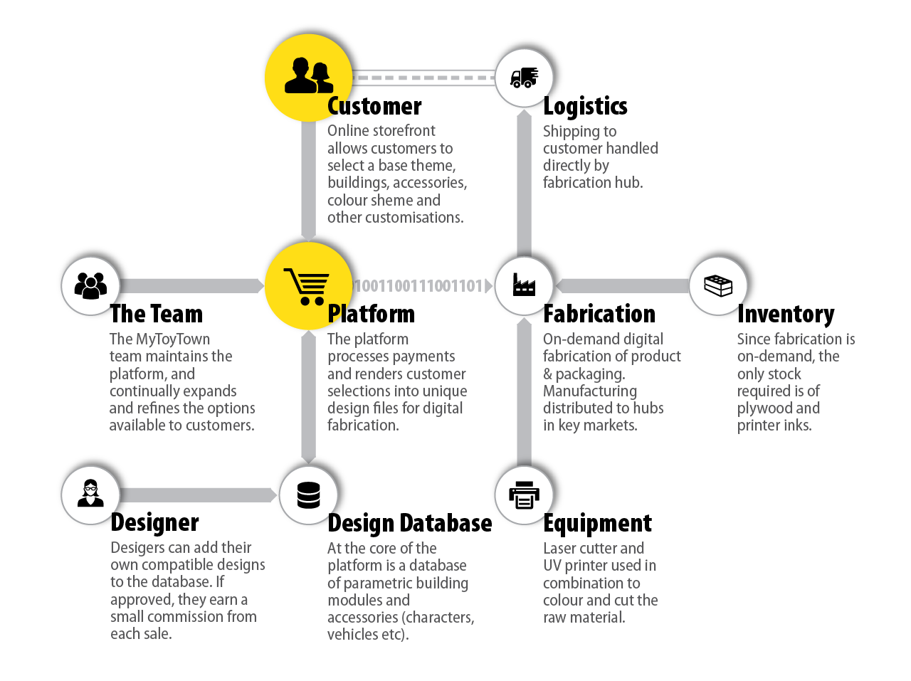 Alongside developing the design the design of the toy itself, I also developed a series of service design models and business plans, thinking through the process of growning MyToyTown from a pipeline-based business model into a platform-based model engaging a community of designers and a decentralized network of manufacturers.