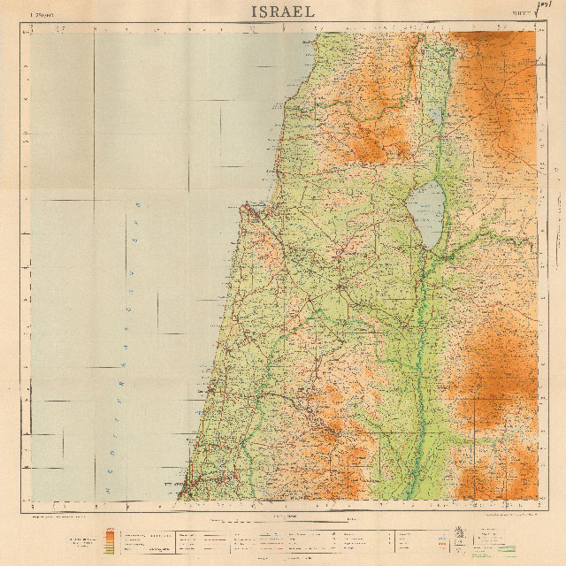 1946 map titled "Palestine", 1:250,000 scale (left). 1951 map titled "Israel", 1:250,000 scale (right).